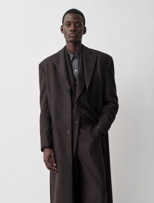 Cappotto monopetto a tre bottoni con risvolti lisi. Completamente foderato e realizzato in 100% lana pesante e compatta con motivo a righe sottili.