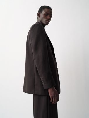Una giacca monopetto dal taglio squadrato. Gessato strutturato su 100% lana pesante compatta. Completamente foderata, con risvolti voluminosi.