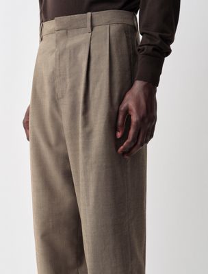 Pantaloni a doppia pinces con vita bassa e gamba larga e sottile. Realizzati in 100% lana leggera effetto mélange.