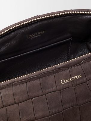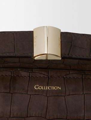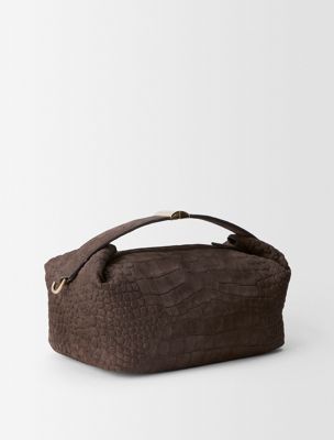 Eine weiche Tasche mit zentralem Reißverschluss und auffälligem Verschluss am Griff. Mit einem verstellbaren Schulterriemen und einer geschwungenen, abgerundeten Form. Geprägtes Krokodilmuster auf Nubuk-Kalbleder.