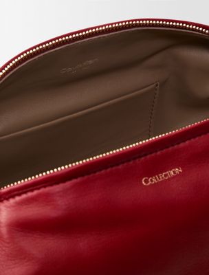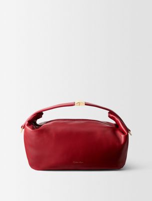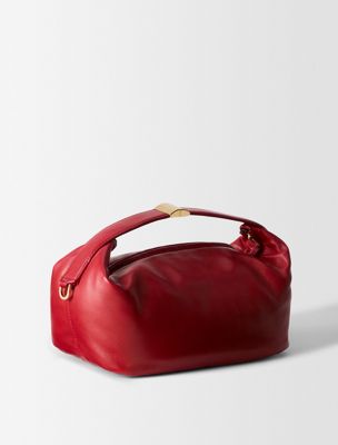 Eine weiche Tasche mit zentralem Reißverschluss und auffälligem Verschluss am Griff. Mit einem verstellbaren Schulterriemen und einer abgerundeten, geschwungenen Form. Hergestellt aus Nappaleder.