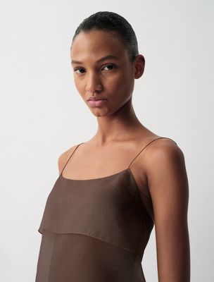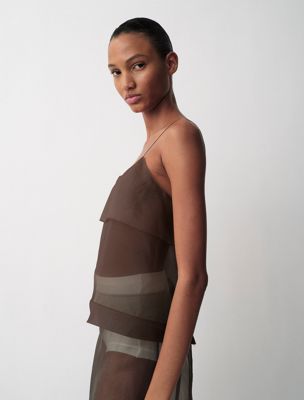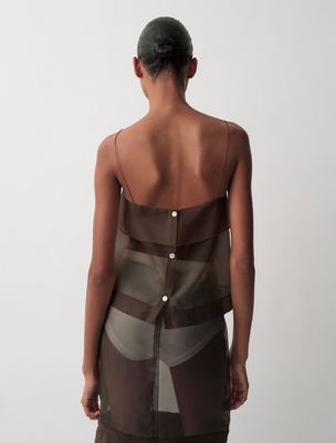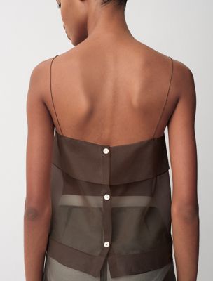 Ein durchsichtiges Tank-Top aus 100% Seidenorganza mit einem schlichten, matten Finish. Dieses Kleidungsstück hat eine doppellagige Brustpartie und Knöpfe am Rücken.